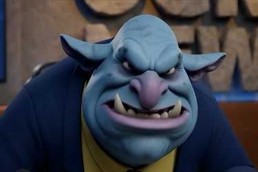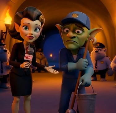 Next, I brought the stills to life using AI video tools (Grok, Firefly, Kling), animating the ogre glaring intensely at the camera. And adding another news anchor, Ann Ghoul. Along with other characters, to tell the tales of the murder of Medusa.