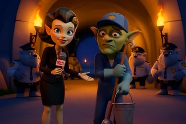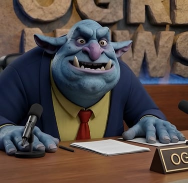 It all started with a simple sketch of the ogre on paper, a comic strip from MonkeyHound Productions. That rough drawing became my reference, feeding into AI image generators (Grok, Flux, Nano) to build the visuals: a massive, ogre in a news studio, roaring headlines straight from his fanged mouth. Gunther Groundbreaker came to life. Hours of prompt tweaking battled the usual AI glitches until the look was just right.